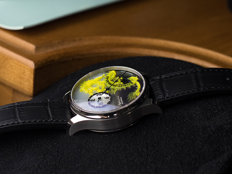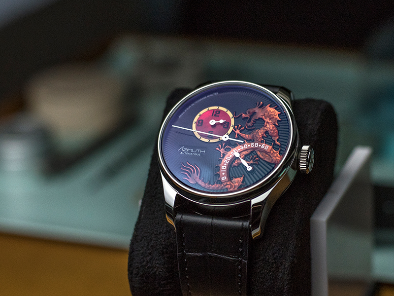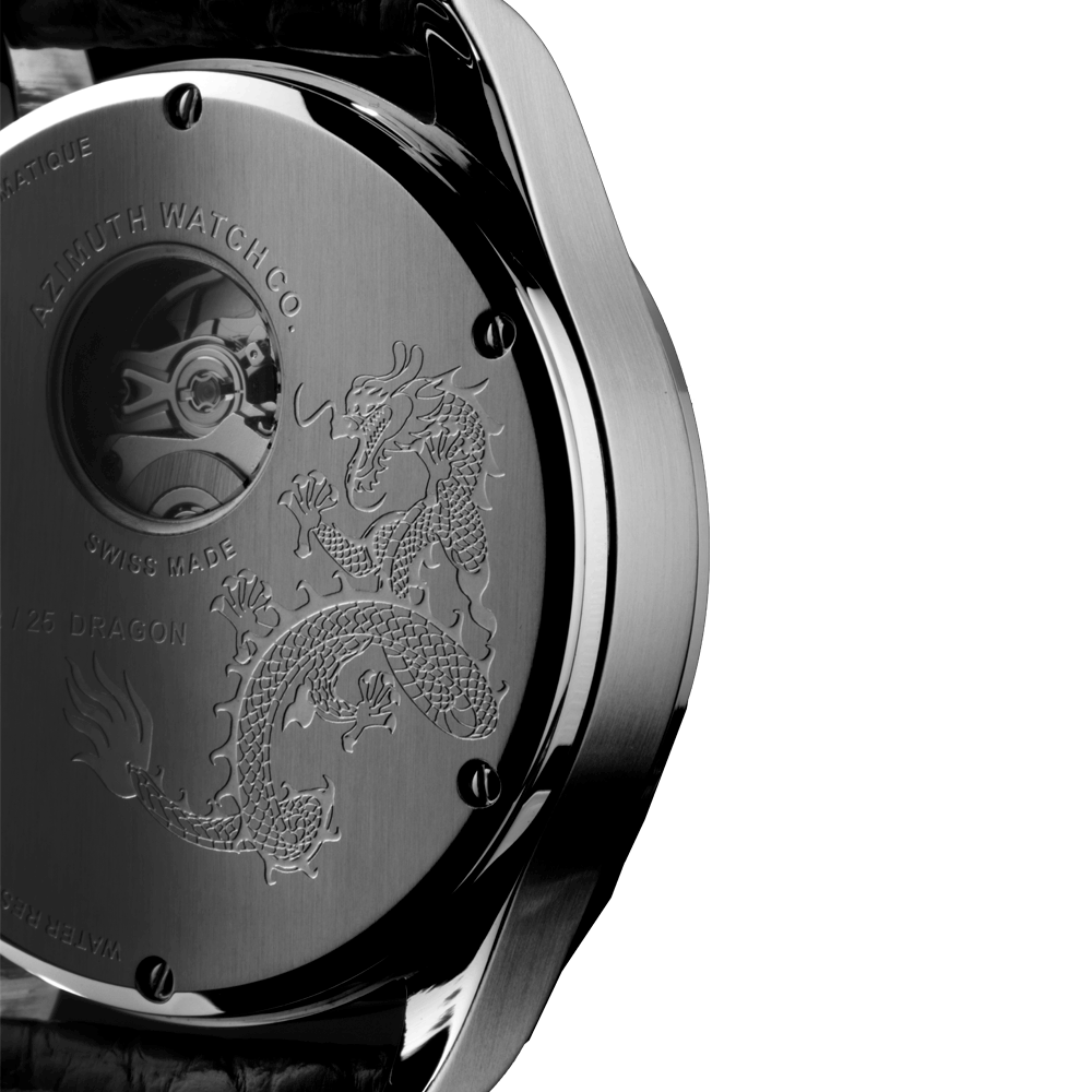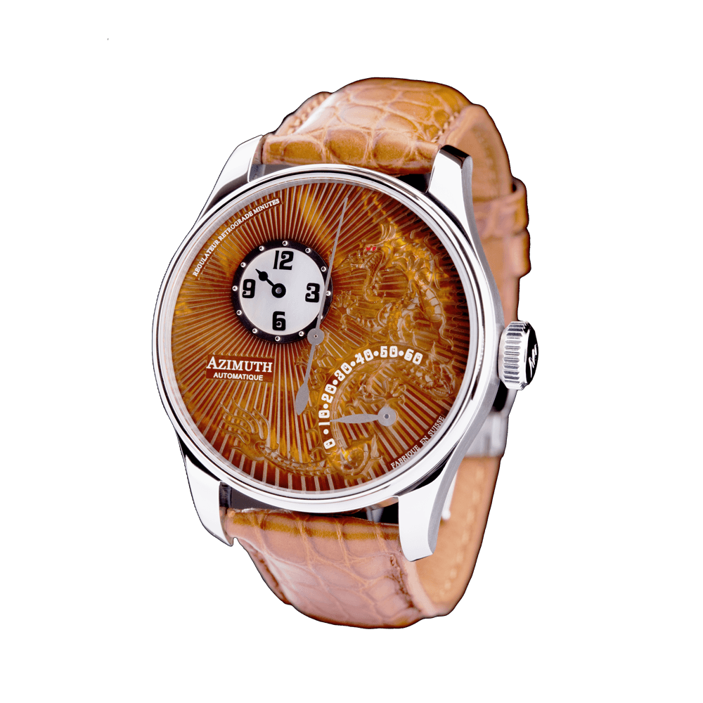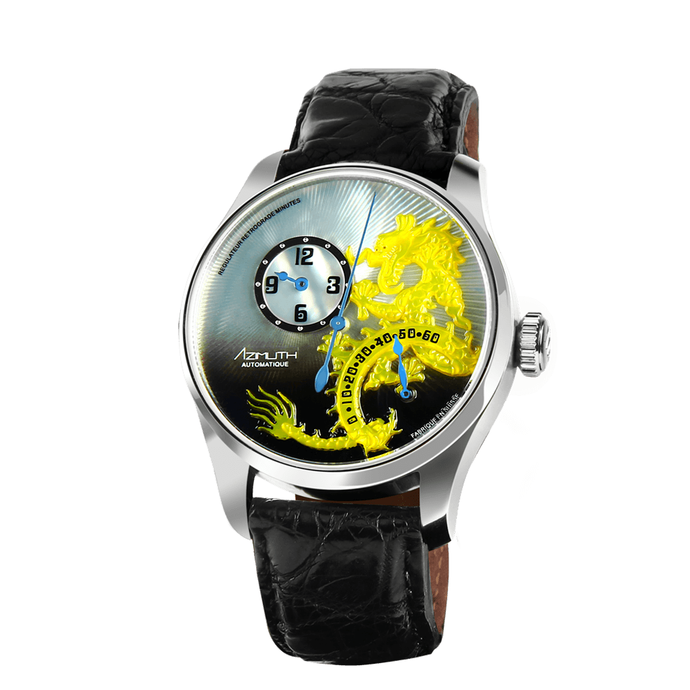 In 2008, Azimuth created the first Round-1 Dragon RRM using a single piece of fragile mother-of-pearl, thick enough to be engraved on, to create the magnificent three-dimensional etching of a majestic dragon. The naturally luminescent mother-of-pearl face set aglow the precision cut detail of each rippling scale on Azimuth’s oriental dragon, while a retrograde timescale that sat atop the dragon’s serpentine body lashed out the minutes with precise mechanisation. Only 25 pieces of each colour were produced and became a hit with every one of collectors for its realistic dragon depiction and innovative use of the retrograde mechanism.