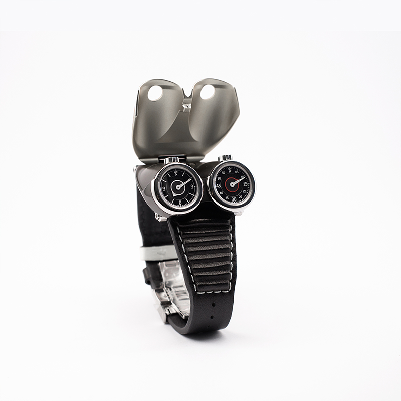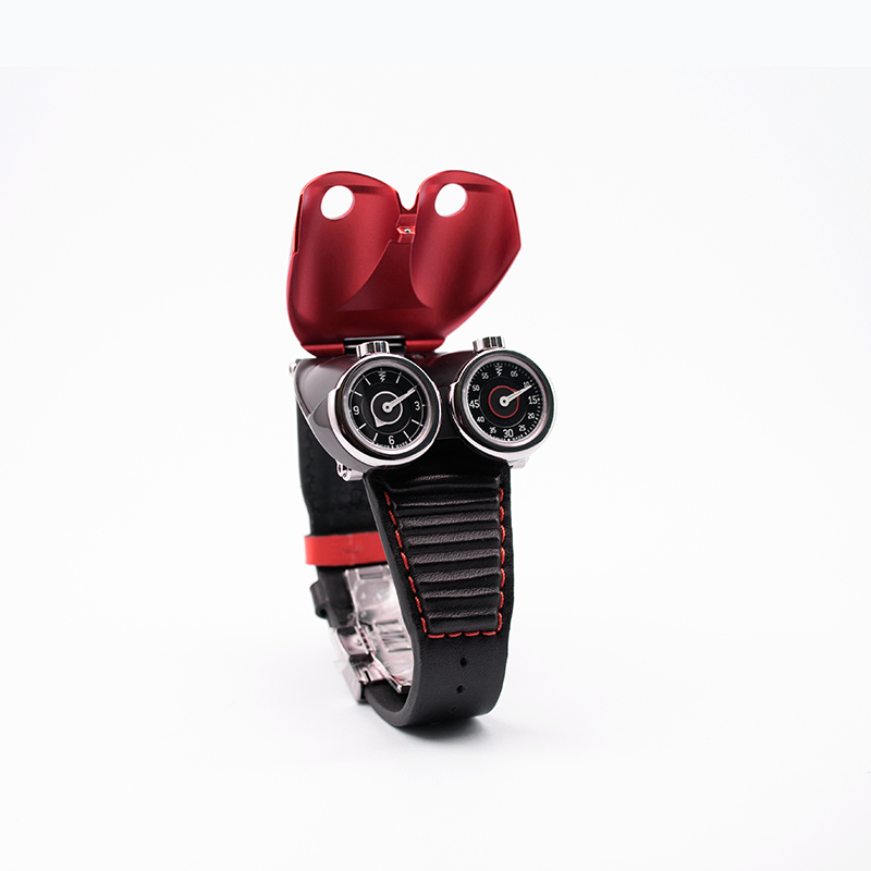 With the well-grinded race tracks giving the nod to this timepiece, Twin Turbo’s striking design features its sculptured case design that resembles the sexy silhouette of the 60s vintage racing cars. But what is truly its high-octane appeal is the mechanism that lies underneath the watch cover – a re-engineered case construction that mimics the technical construction of the car bonnet, which gives the wearer an intimate engagement as he flips it up to reveal the engine block.