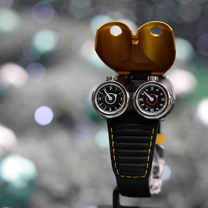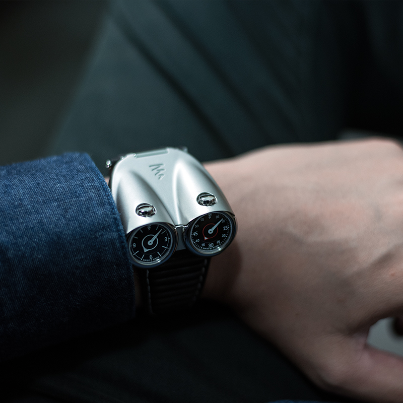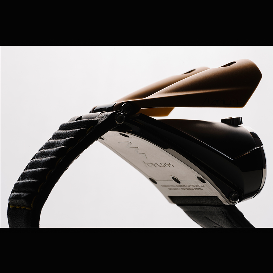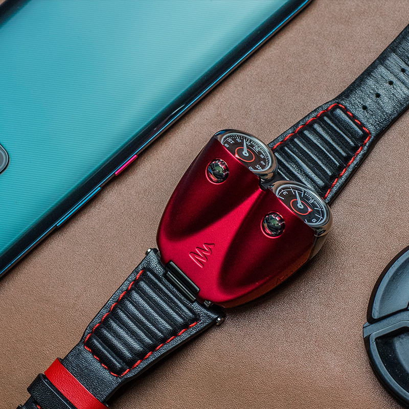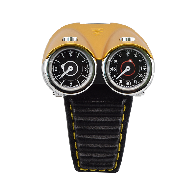 Powered by a rare vintage calibre from the 1960s, the manual-winding movement faithfully mirrors the gearbox system of the yesteryears automotive technology. The dials of the Twin Turbo take their design cues from vintage speedometers on the dashboard, which offers the wearer two time-zone readings at a glance. The Twin Turbo is available in the following executions: Yellow, Anthracite and Silver. Each is a limited edition of 88 pieces. Azimuth has also created a boutique edition in Sporty Red, known as The TT PORTFOLIO, executed in only 50 pieces.